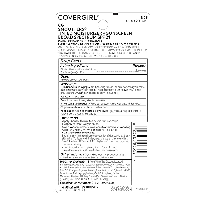 COVERGIRL Smoothers Lightweight BB Cream, Fair to Light 805, 1.35 oz (Packaging May Vary) Lightweight Hydrating 10-In-1 Skin Enhancer with SPF 21 UV Protection
