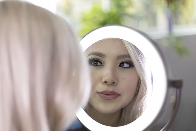 - RING LIT HEAD - 9-inch diameter head with a 1-inch circular day light color 6400K LED ring light, lets you see everything you need for your beauty routine and includes bright energy-saving LED lighting, consumes up to 70% less electricity than regular incandescent & fluorescent bulbs