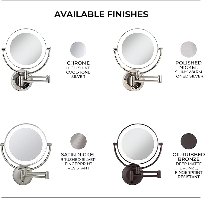 - VARIATIONS AVAILABLE - in chrome, satin nickel, polished nickel and oil rubbed bronze finish; and in 5X/1 or 10X/1X magnification configurations