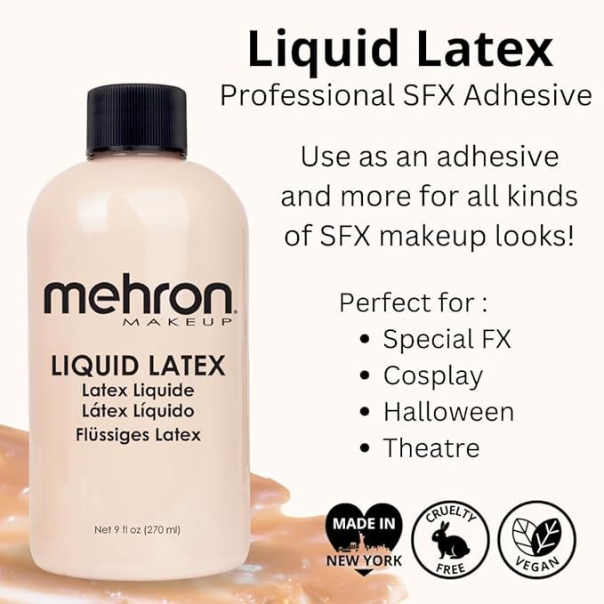 - PROFESSIONAL: Mehron's Liquid Latex is a professional, vegan formula that can be used as an adhesive to attach appliances to the skin, to seal wax, or to create textured effects like aged or peeling skin. True professional grade, trusted by Hollywood and Broadway pros since 1927.