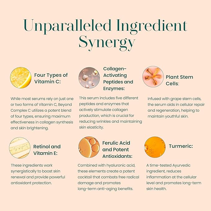 - π Why Choose Beyond Complex C?: Hylunia's serum goes beyond the ordinary by incorporating four types of Vitamin C, collagen-activating peptides, and plant stem cells for a holistic skincare experience. In contrast, most serums use only one or two types of Vitamin C, limiting their effectiveness. Beyond Complex C's high-potency antioxidants and retinol deliver comprehensive benefits, ensuring your skin receives the ultimate care and rejuvenation it deserves.