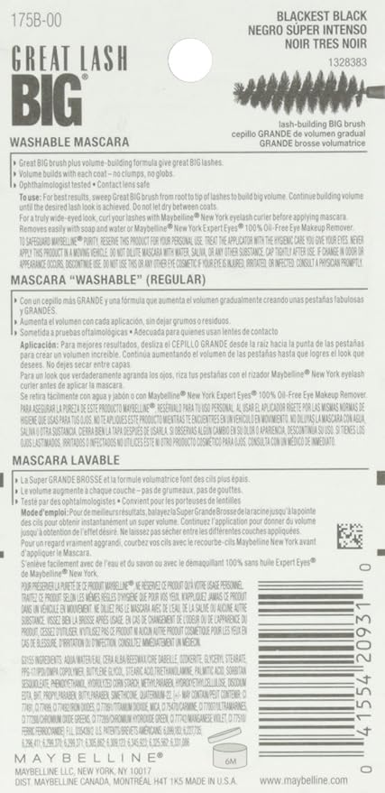 Maybelline New York Great Lash Big Washable Mascara, Blackest Black 130, 0.34 Fluid Ounce