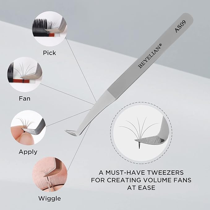 Volume Lash Tweezers Beyelian Lash Tweezers for Eyelash Extensions, Curved L High Precision Tip for Mega Fans, Stainless Steel AS09 Silver.