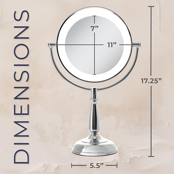 - DIMENSIONS - This Zadro LED lighted makeup mirror, thoughtfully designed with an adjustable touch base, stands at an elegant 17 inches tall and 11 inches wide, providing a compact yet spacious frame, while its 7-inch reflective mirror offers a perfectly balanced viewing area, allowing for a crystal-clear, enhanced reflection that is ideal for all your makeup, grooming, and beauty routines, all with the added convenience of customizable lighting and touch-sensitive controls for a personalized experience.