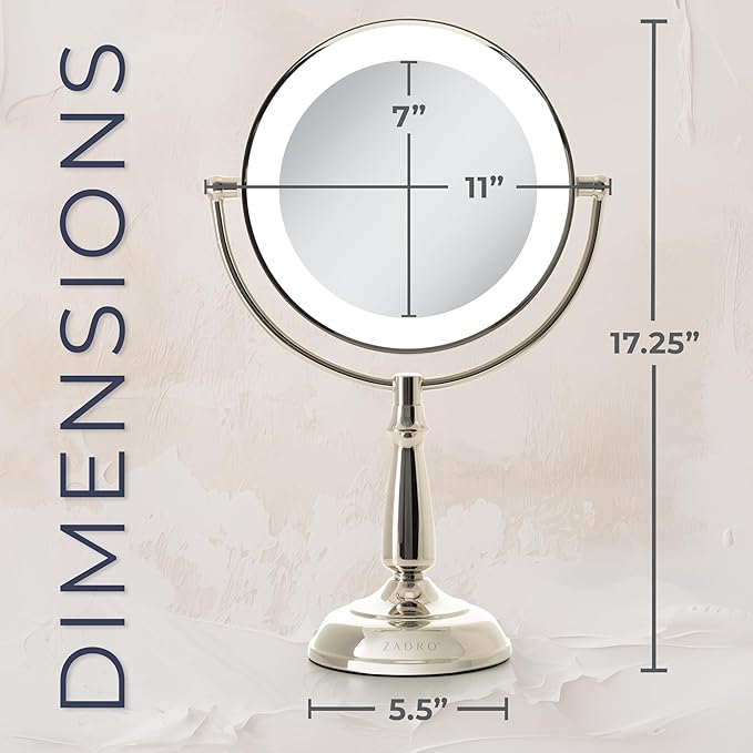 - DIMENSIONS - This Zadro LED lighted makeup mirror, thoughtfully designed with an adjustable touch base, stands at an elegant 17 inches tall and 11 inches wide, providing a compact yet spacious frame, while its 7-inch reflective mirror offers a perfectly balanced viewing area, allowing for a crystal-clear, enhanced reflection that is ideal for all your makeup, grooming, and beauty routines, all with the added convenience of customizable lighting and touch-sensitive controls for a personalized experience.