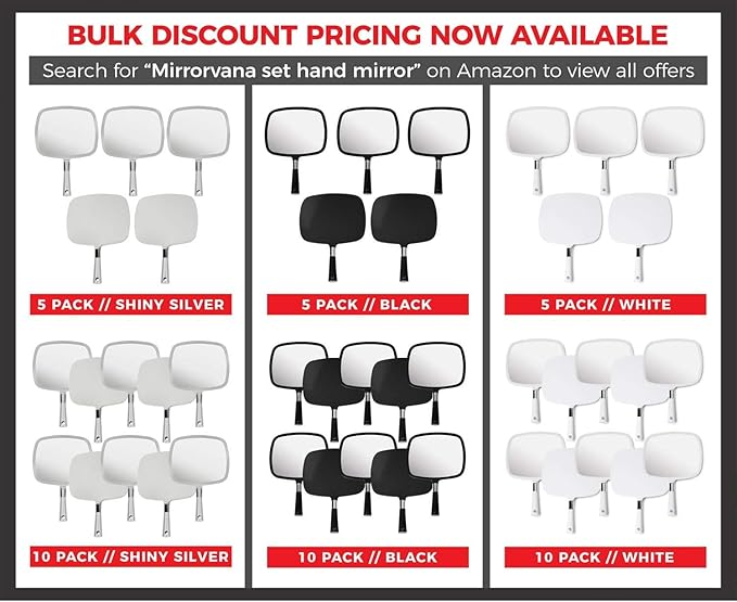 - This PACK / SET includes FIVE Mirrorvana Large & Comfy Hand Held Mirror (2017 Model), Model # MVHH79A1X, for a GREAT VALUE. Save on average an extra $10 when you buy bulk hand mirrors like this pack/set of 5 versus buying just one.