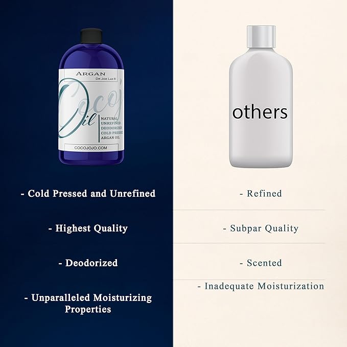 - HAIR OILS ORGANIC ARGAN OIL: COCOJOJO Argan Oil for hair is 100% Pure and Natural Argan oil of Morocco with Deodorized scent free of the Highest Premium Quality. Made with Grade A, Unrefined, and Cold Pressed quality from US facility.