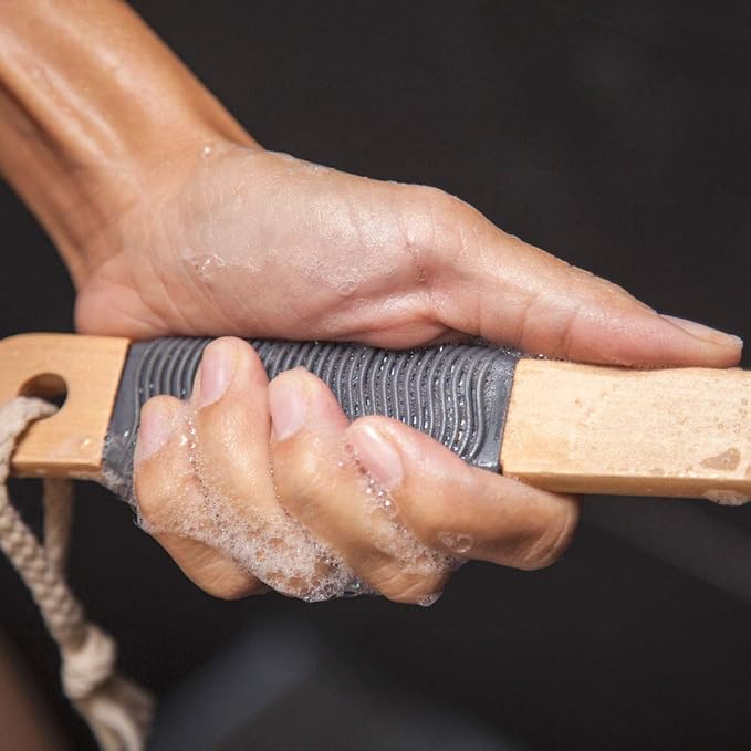 - EXTENDED REACH & BETTER GRIP – Our Long handled back loofah reaches 17” plus creating ease for your back and feet. More girth on the handle creates better grasp. The textured rubber grip provides a comfortable and secure, no-slip grip even when wet.