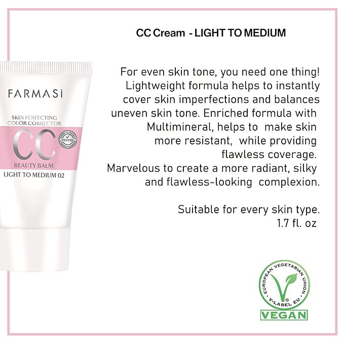 FARMASi CC Color Control Cream, Natural and Flawless Finish, Enriched Formula with Multimineral & Spf 25+, All-Day Hold, All Skin Types, 1.7 fl. oz, Light to Medium