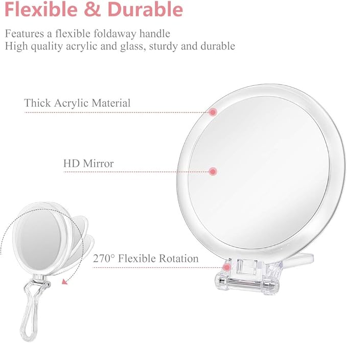 - Multi-use Design: Features a flexible foldaway handle which can be rotate multiple angles, can be used as hand mirror, tabletop mirror, and hanging mirror.