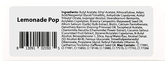 - Ingredients: BUTYL ACETATE, ETHYL ACETATE, NITROCELLULOSE, ADIPIC ACID/NEOPENTYL GLYCOL/TRIMELLITIC ANHYDRIDE COPOLYMER, ACETYL TRIBUTYL CITRATE, ISOPROPYL ALCOHOL, STEARALKONIUM BENTONITE, ACRYLATES COPOLYMER, BRASSICA CAMPESTRIS (RAPESEED) SEED OIL, ALLIUM SATIVUM (GARLIC) BULB EXTRACT, BIOTIN, CALCIUM PANTOTHENATE, OENOTHERA BIENNIS (EVENING PRIMROSE) OIL, CHAMOMILLA RECUTITA (MATRICARIA) FLOWER EXTRACT, CUCUMIS SATIVUS (CUCUMBER) FRUIT EXTRACT, STYRENE/ACRYLATES COPOLYMER, N-BUTYL ALCOHOL, BENZOPHENONE-1, SILICA, TRIMETHYLPENTANEDIYL DIBENZOATE, MICA, AQUA/WATER/EAU, ALCOHOL DENAT. (SD ALCOHOL 40-B), FERROUS GLUCONATE, PROPYLENE GLYCOL, TOCOPHERYL ACETATE, CARTHAMUS TINCTORIUS (SAFFLOWER) SEED OIL. MAY CONTAIN: CI 77891, CI 77742, CI 77491, CI 77266, CI 77510, CI 19140, CI 15880.