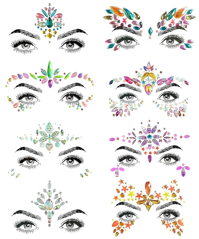 8 Pc Music Rave Face Jewels: Rhinestone Crystal Gems for Eyes, Body & More