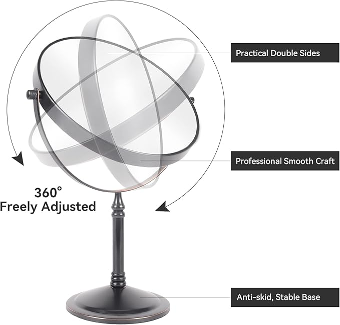 - 10x Magnifying¦The 10x magnified makeup mirror glass is concave and would zoom in your face to see every detail for eye makeup and so on(Kindly suggest to choose lower magnification like 7x if you’re new to magnifying mirror) .The other side is 1x regular glass would reflect your whole face without magnification. And you could rotate the desktop mirror flexibly to change between 2 sides.