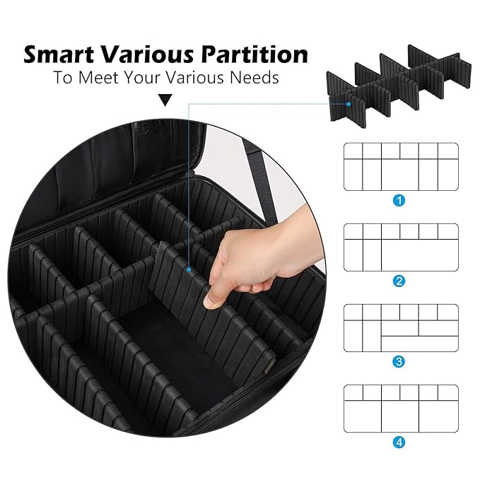 - ★DIY SMART DESIGN: Our makeup travel case comes with 9 adjustable EVA dividers, you can move the partitions as needed to fit different cosmetics and keep them perfectly separated and organized.