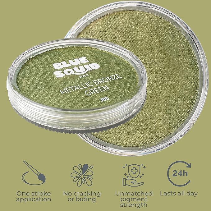 - π§βπ¨ π ππ§πππππ ππ₯π’π‘ππ ππππ ππ‘π ππ’ππ¬ π£πππ‘π§: Blue Squid Metallic Bronze face paint makeup is the go-to choice for professional makeup artists and performers, thanks to its vibrant colors, smooth application, and long-lasting wear. Perfect for creating intricate designs and bold statements, it's the trusted tool for professional face paint experts in the industry. The Net weight is 1oz.