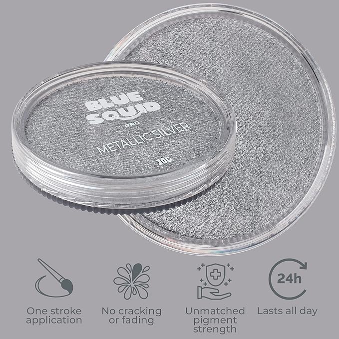 Blue Squid Face Paint Water Based Single Cake Professional Face Paint & Body Paint - Water Activated, Kids Adults Face Painting for Costume, Halloween Makeup, Cosplay - Metallic Silver Face Paint 30g
