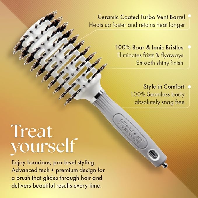 Olivia Garden Ceramic + Ion Turbo Vent Combo Hair Brush - Not Electrical - Ionic and 100% Boar Bristles - Professional Round Blowout Brush for Normal to Thick Hair