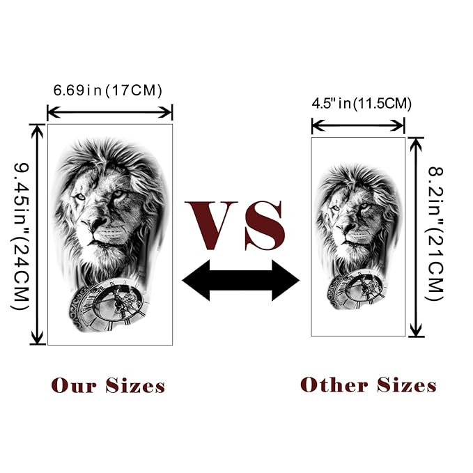 - [Large Size & Large Quantity Temporary Tattoos] Large size half arm tattoo stickers can cover your body parts larger, size is 9.45 * 6.69 inch (24 * 17cm) 12 sheets, 4.1 * 2.4 inch (10.5 * 6cm) 24 sheets .You can share these temp tattoos for adults with your family and friends. Suitable for parties, school, holidays, nightclubs, beaches, weddings, music festivals, costumes, Halloween and daily life. Mixed and match a great combination of tattoos such as 3D Half Sleeve Temporary Tattoos, Halloween Scary Lion Wolf Tiger Skull Skeleton Tattoos taht your friends will think it is real tattoos!