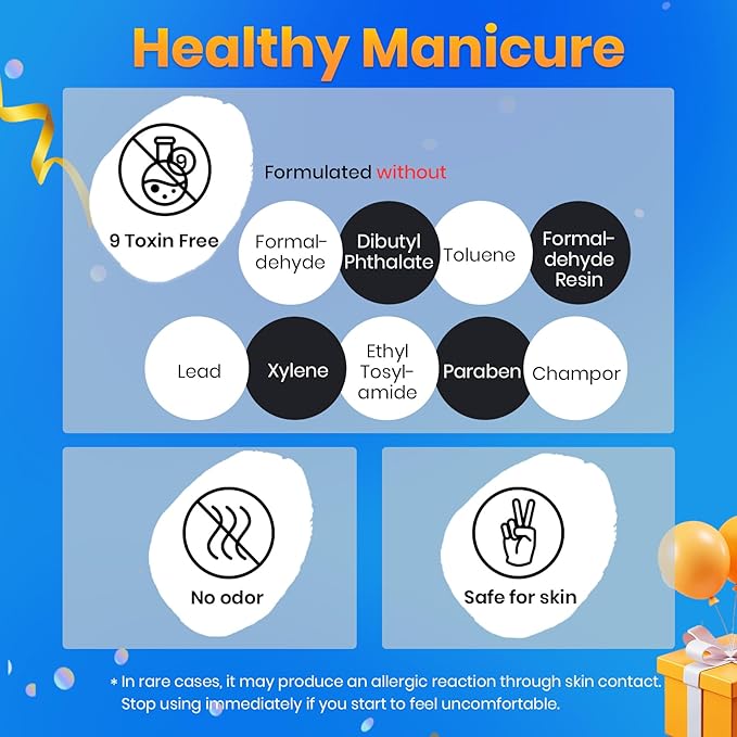 - [Safety Elements] This product may cause an allergic reaction if it comes into contact with the skin. It is important to read the directions for use carefully and only apply the product to nails. Avoid contact with the eyes, mouth, and skin. In case of contact with these areas, rinse immediately with water and seek medical attention if necessary. Discontinue use of the product if redness and itching develop. Keep the product out of reach of children.