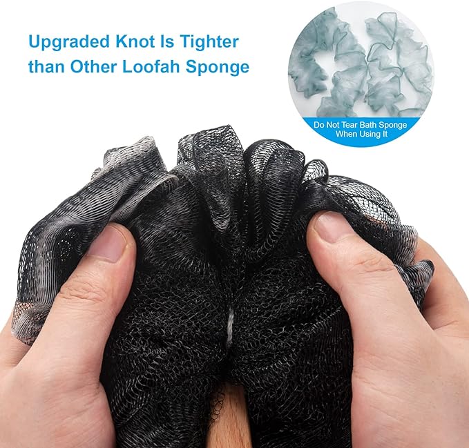 AmazerBath Shower Sponge Loofah Back Scrubber, PE Soft Mesh Loofah Body Scrubber with Long Wooden Handle, Bath Sponge for Men Women (Black)