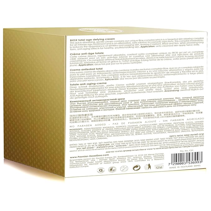 - BIOX CLASSIC BEAUTY COLLECTION: The DEAD SEA PREMIER BIOX ANTI-AGING CREAM is all you need to feel young, ageless, and beautiful; containing original Dead Sea salt and minerals, Aloe vera gel, vitamin E oil, retinol, jojoba oil and more to make skin feel softer and fresher while minimizing lines, wrinkles, crow’s feet, and sagging skin; this face moisturizer is made with advanced liposome technology in Israel, it contains 2.04 ounces of Classic Total Age-Defying Treatment Cream Lotion.