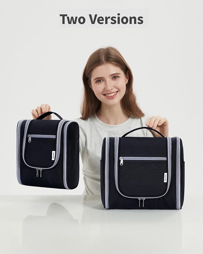 - DETAILS ORIENTED - Buit-in large metal hook allows hanging the toiletry case from towel rack, coat hook or whereever is available, making your toiletries and cosmetics displayed well for easy access, saving bathroom counter space as well. Water-resistent and durable fabric protects your gear from spills. Soft fabric and reliable zippers. Wide opening and rectangle shape makes it easy to stand on its own