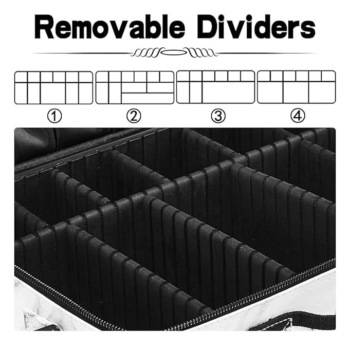 - 【HUMANITY DESIGN】 Built-in 10 pcs adjustable dividers. You can design the internal compartments by adjusting the dividers to fit different cosmetics and keep them perfectly separated and organized. The soft sponge dividers can also prevent your cosmetics from being damaged due to collision.