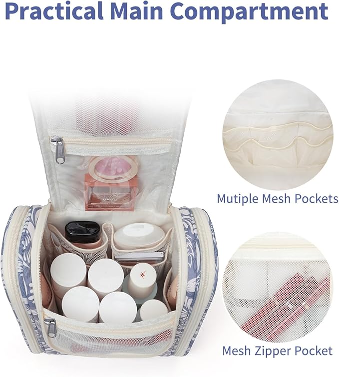 - DETAILS ORIENTED - Buit-in large metal hook allows hanging the toiletry case from towel rack, coat hook or whereever is available, making your toiletries and cosmetics displayed well for easy access, saving bathroom counter space as well. Water-resistent and durable fabric protects your gear from spills. Soft fabric and reliable zippers. Wide opening and rectangle shape makes it easy to stand on its own