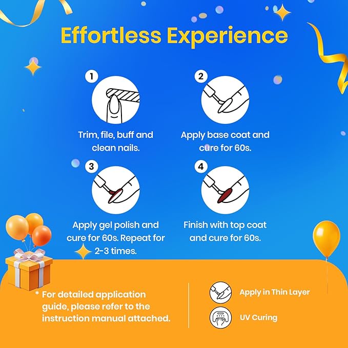 - Soak off LED Gel Nail Polish: The colors of the red shades kit - all seasons gel nail polish set need to be cured under an LED nail dryer. Base and Top coat are required. The average time for an LED nail lamp is 60-120 secs. Perfect for all daily working or dating occasions, such as birthdays, holidays, anniversaries. This item is UV gel. It remains sticky after curing and must be used with a base coat and top coat!