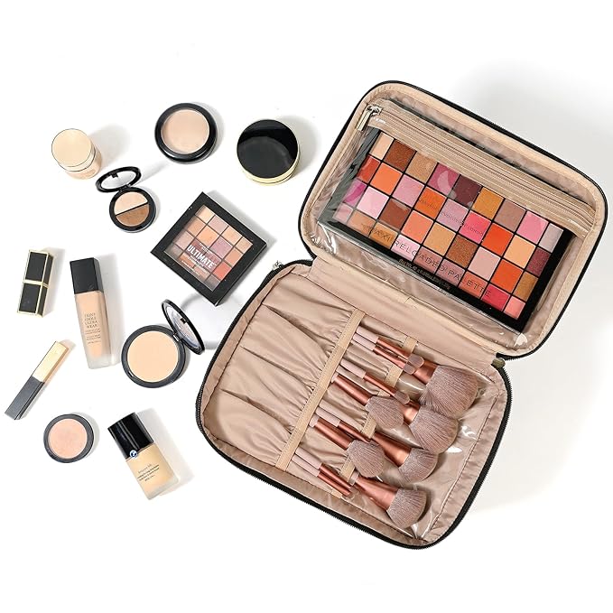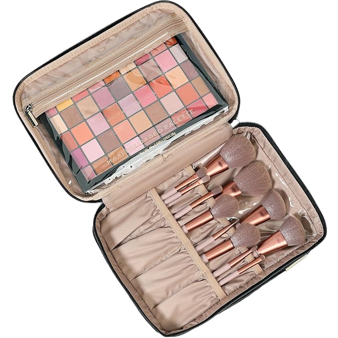 - HOLDS SUBSTANTIAL MAKEUP BRUSHES - There are eight brush slip pockets on the top compartment to fit different sizes of brushes. The clear plastic lining provides an easy-to-clean surface