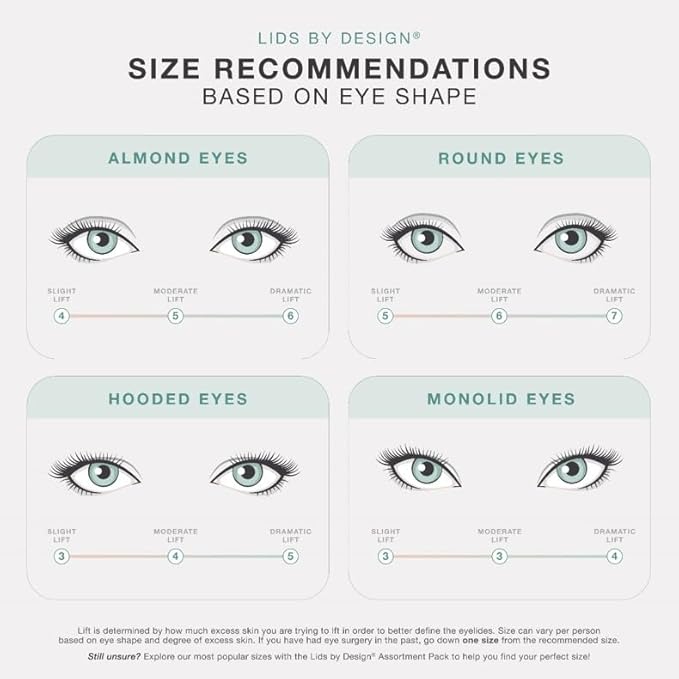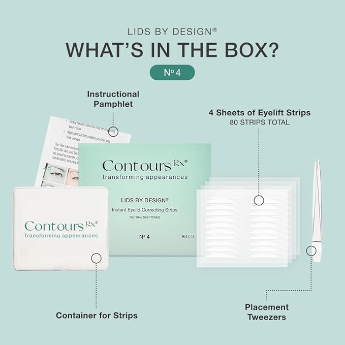 - Contours Rx Quality - Lids by Design eyelid tape assortment pack comes with 4 different sizes–a subtle 4mm size to a more dramatic 7mm size in look and eyelid definition. Correcting eyelid strips include 80 strips, a months supply of relief from heavy hooding, excess skin, and tired looking eyes. Each set comes with tweezers for a fast and smooth application.