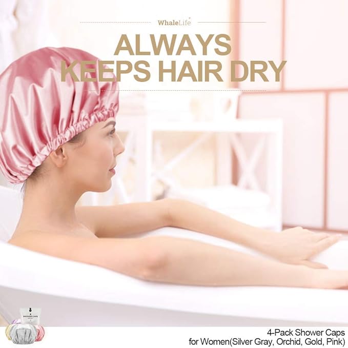 Shower Cap for Women Reusable Extra Large Shower Caps for Men Satin Double Layer EVA Waterproof Long Hair Caps(Silver Gray, Orchid, Gold, Pink 4 Pack)