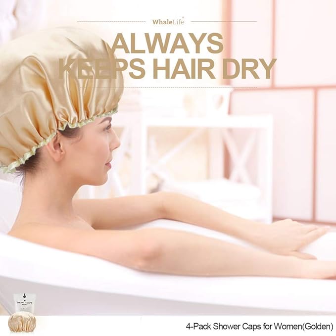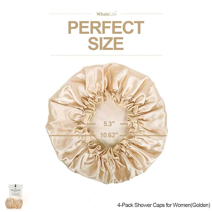 Shower Cap for Women Reusable Extra Large Shower Cap for Men (Golden 4 Pack Large) Satin Double Layer EVA Waterproof Long Hair Cap