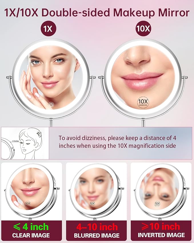 - [1X/10X MAGNIFICATION] - This vanity mirror is double-sided design, the 1X magnification side is suitable for daily use. The 10X magnification side is suitable for detailed makeup and daily skin care(such as wearing contact lenses, drawing eyeliner, plucking eyebrows, etc.)