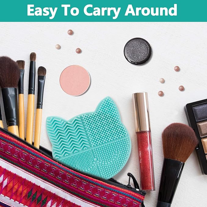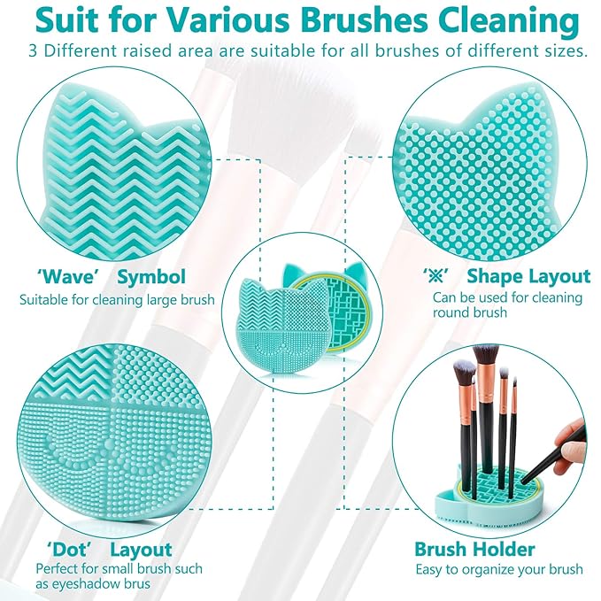 TailaiMei 2 in 1 Makeup Brush Cleaning Mat With Drying Holder, Silicon Cat Shaped Cleaner Pad, Cosmetic Organizer Rack, Portable Washing Tool for Makeup (Green)