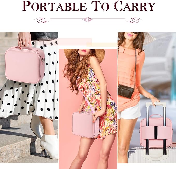 Travel Makeup Bag Organizer, 10.2 Inches Portable Makeup Train Case Cosmetic Brush Artist Storage Bag with Adjustable Dividers and Shoulder Strap (Pink)