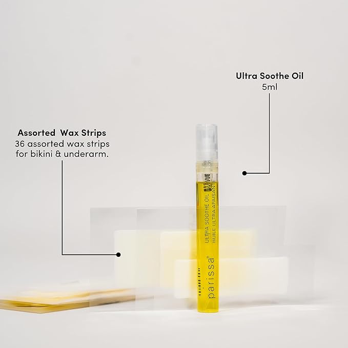 Parissa Bikini Wax Strips Kit | Ready-to-Use Hair Removal for Bikini, Brazilian & Underarm | Natural, Sensitive Skin Formula with Post-Wax Ultra Soothe Oil | 36 Strips (18 x 2), 3 Sizes