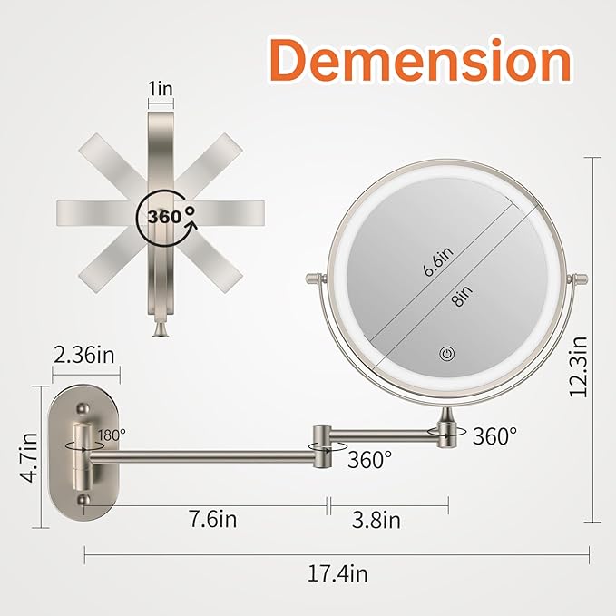 - ๐ก๐๐๐ยฐ ๐๐จ๐ญ๐๐ญ๐ข๐จ๐ง & ๐๐ฑ๐ญ๐๐ง๐๐๐๐ฅ๐ ๐๐ซ๐ฆ:The lighted makeup mirror with magnification is mounted on the wall, designed with a extendable arm. 360 degree free rotation provides you with a comfortable viewing angle when putting on makeup, shaving or wearing contact lenses. It can be folded against the wall to save space when not in use