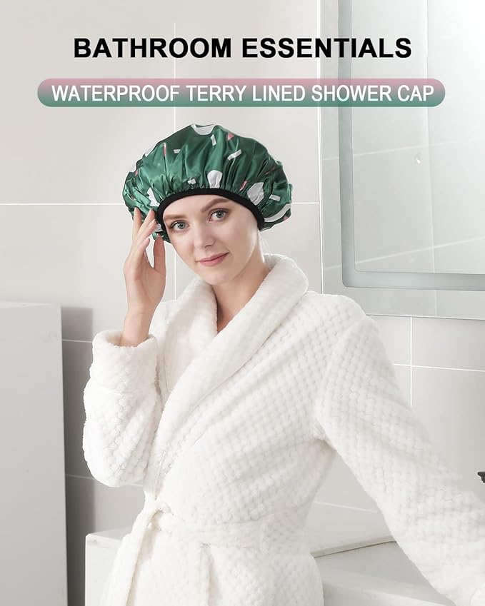 YIZIJIZI Triple Layer Reusable Waterproof Shower Cap for Women Large Terry Lined Hair Cap for Long Thick Hair Travel Bath Care Green Flowers