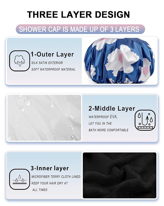 - 【3 layer fabric】shower cap is made of three layers, soft satin fabric, waterproof EVA cloth, terry cloth for water absorption. The unique terry lining design helps your hair dry.