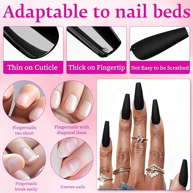 LoveOurHome 100pc Matte Coffin Press on Nails Long Fake Nails Black False Nails Medium Ballerina Acrylic Nails Press ons Nail Coffin Artificial Nails Women Girls Black Fake Fingernails 10 Sizes