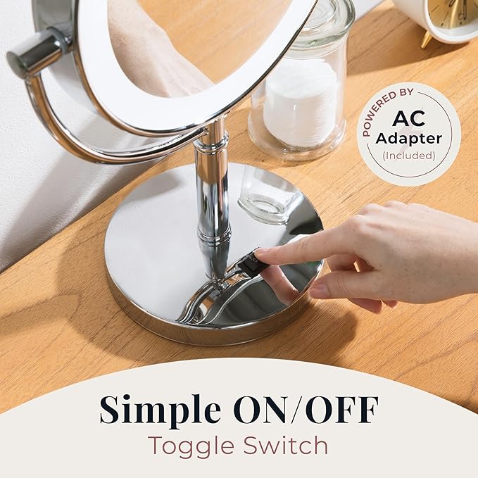 - POWERFUL LED LIGHTING - The Laguna mirror features a simple on/off switch operation for its powerful, energy-efficient LED lighting, providing bright, consistent illumination with minimal energy consumption, and is conveniently powered by the included AC adapter for uninteruped use, making it an easy-to-use and eco-friendly addition to any vanity setup.