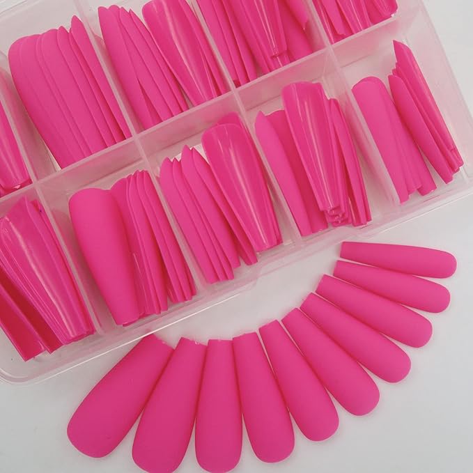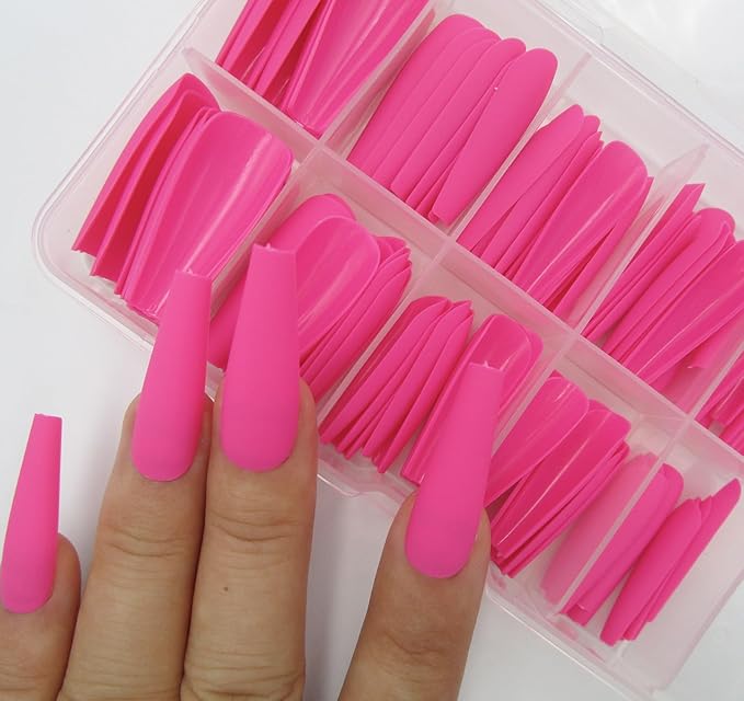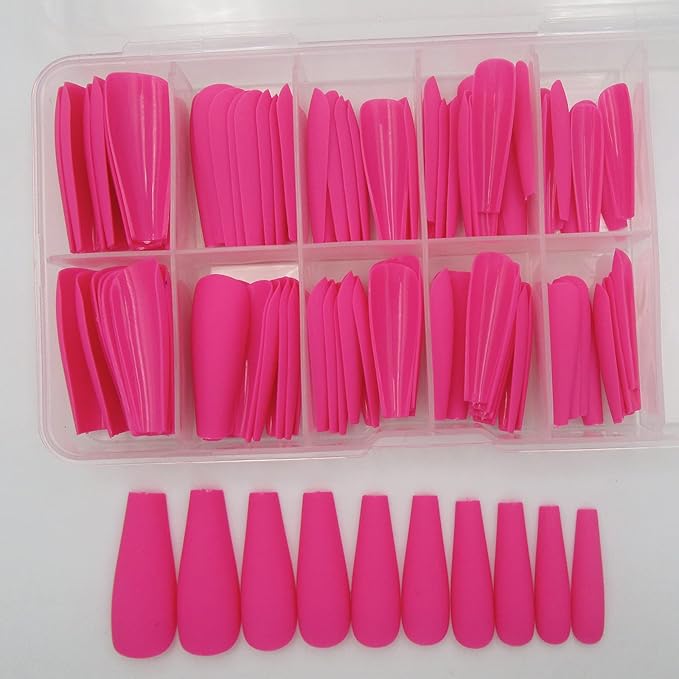 LoveOurHome 100pc Coffin Press on Nails Long Fake Nails Matte Full Cover False Nails Press ons Artificial Nail Medium Ballerina Fake Fingernail Hot Pink Presson on Nail Tips for Women Kids Girls