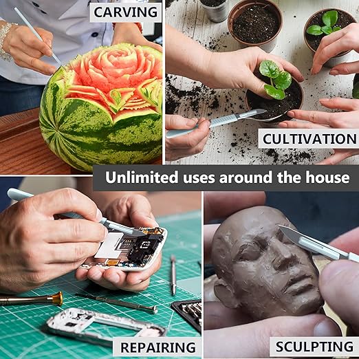 - A TON OF OTHER USES mycology, comedones removal, prototyping electronics, taxidermy supplies, such as scapula , dermablade for face, disposable scalpel blades for model making, wood and clay sculpture, desktop work, small cuts and trimming, disposable surgical scalpel for dermaplaning blades, biology projects in school and labs, arts and crafts, trimming, gardening, vinyl cuts, wood projects, surgery medical dissection , dermaplane razor for women face, scalpels surgical for skin etc