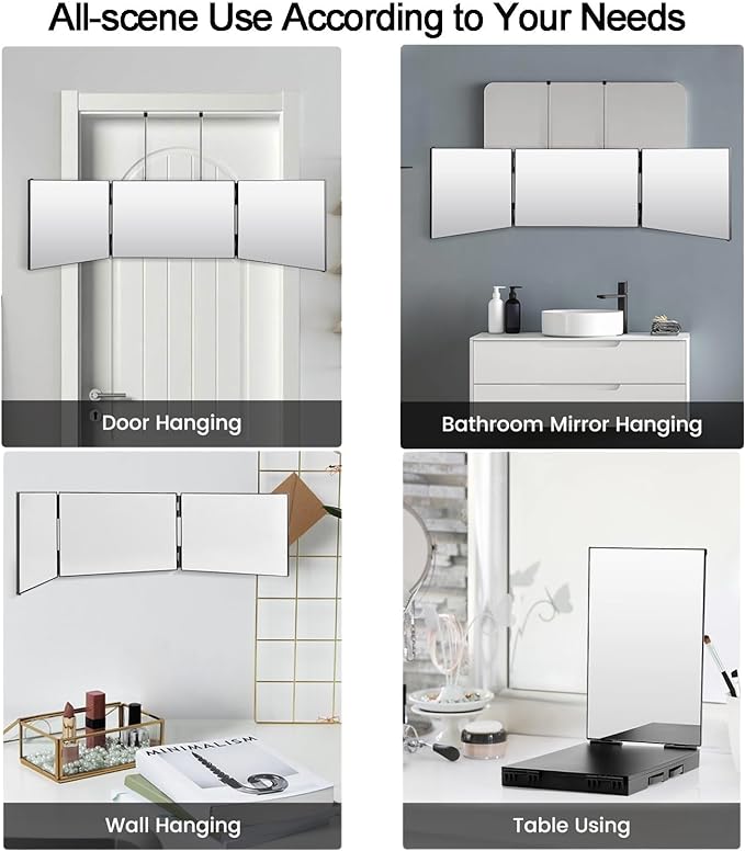 - MADE TO LAST, HANDS FREE - Thanks to its strong adjustable brackets, all you need is a door to position our trifold mirror at the perfect height. Kindly Note: Please peeling the protective film off before using.