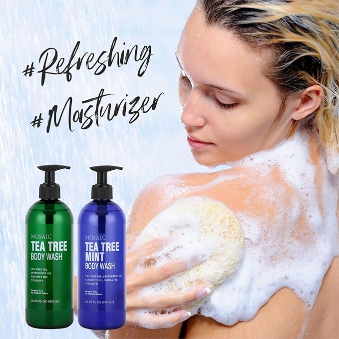 - TEA TREE OIL BODY WASH & FOOT WASH – Mosaic hypoallergenic body wash helps with eczema, ringworm, acne body wash, body odor, skin irritation, itchy skin, athletes’ foot, Thanks to Tree Oil and Peppermint Oil.