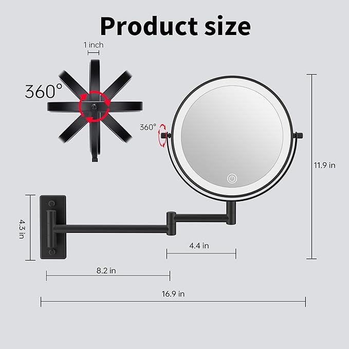 Wall Mounted Makeup Mirror with Lights, 8" Bathroom Vanity Magnifying Mirror Wall Mount with 1X/10X Magnification and Extendable Arm,Black