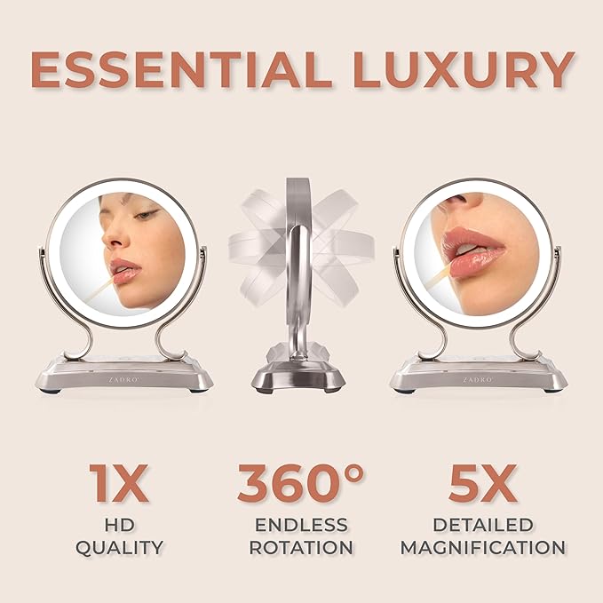 - DIMENSIONS - 16 inches tall, Oversized mirror to see full face & hair, convenient 5 time magnification and everyday 1 time mirror side, 360 degree endless mirror head rotation, plug in with ac adapter (included).