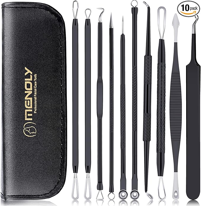 MENOLY Pimple Popper Tool Kit 10 Pcs Blackhead Remover Tool Zit Popper for Blemish, Pimple Comedone Extractor Acne Tool for Blackheads, Acnes, Whiteheads Nose Face Tools with Leather Bag