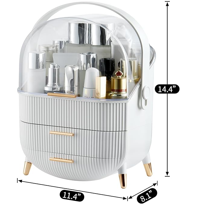 About This Appearance and size:11.4"L×8.1"W×14.4"H,Large capacity makeup organizer with 2 drawers,top apartment,even a 7.5”H bottle of skincare can fit in... Read more